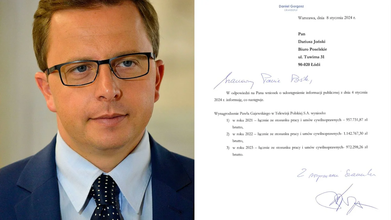- Po objęciu posady prezesa Telewizji Polskiej przez Jacka Kurskiego w 2016 został mianowany zastępcą dyrektora Biura Spraw Korporacyjnych TVP (nie dysponując wyższym wykształceniem, oraz nie posiadając zdanej matury, którą to zdał dopiero w 2019 r.) – napisał na swoim profilu w portalu X (dawniej twitter) Joński. Dodał też, że od 2023 roku Paweł Gajewski pracuje w NBP.