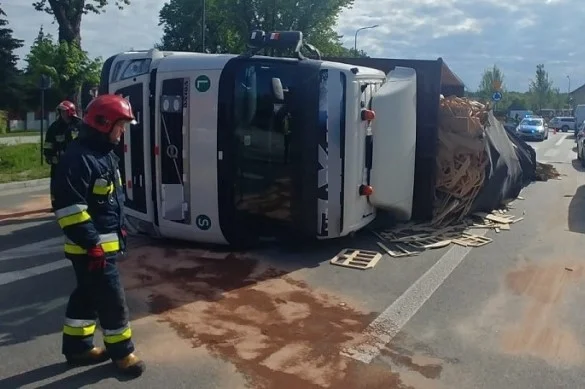 Na miejscu pracują służby, które ustalają, co było powodem przewrócenia się ciężarówki. W zdarzeniu poszkodowany został jej kierowca, którego przy pomocy sprzętu hydraulicznego musieli z kabiny wydobyć strażacy.